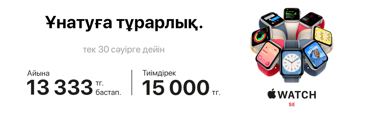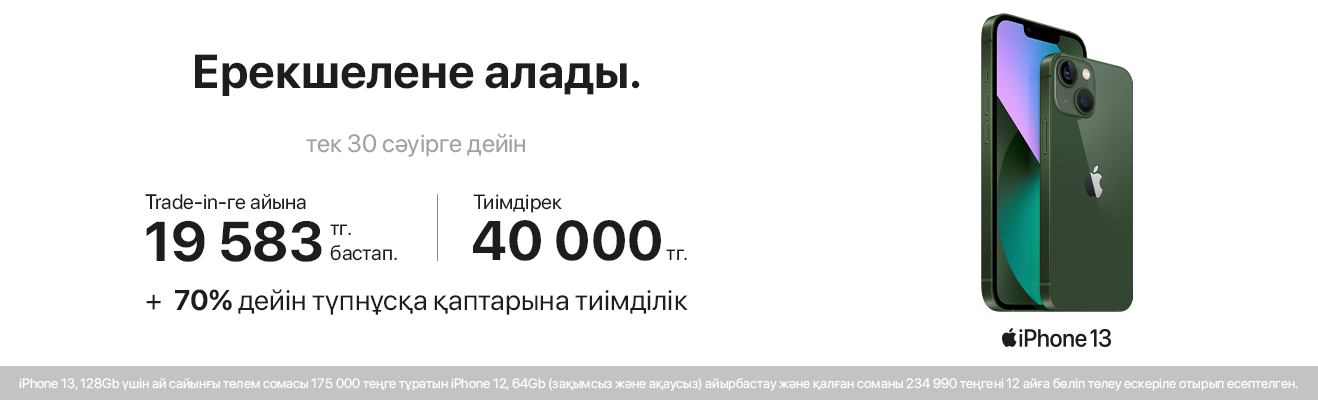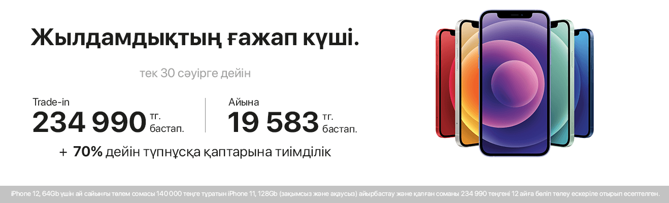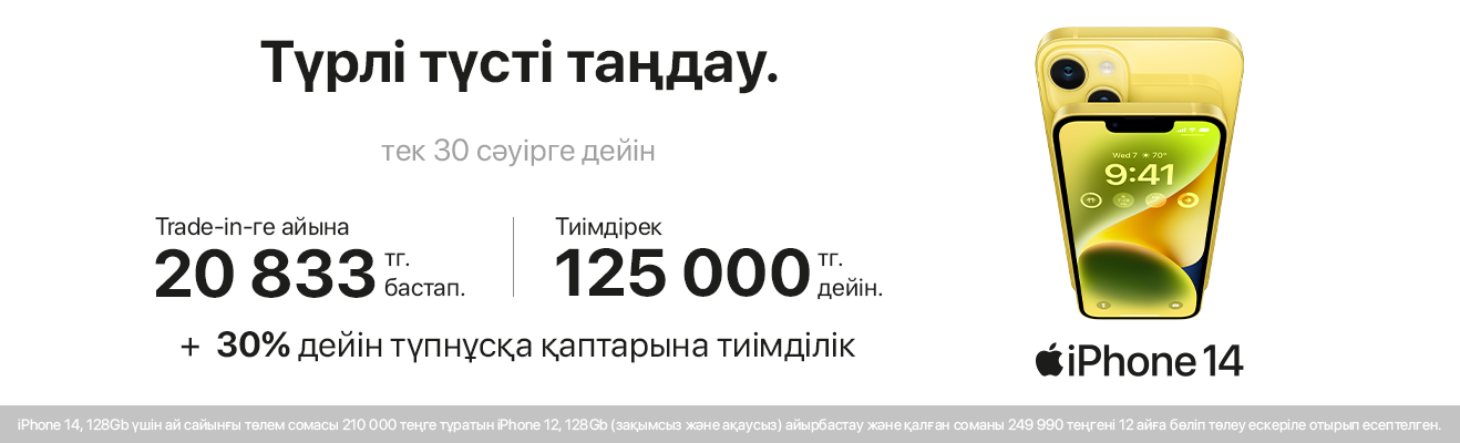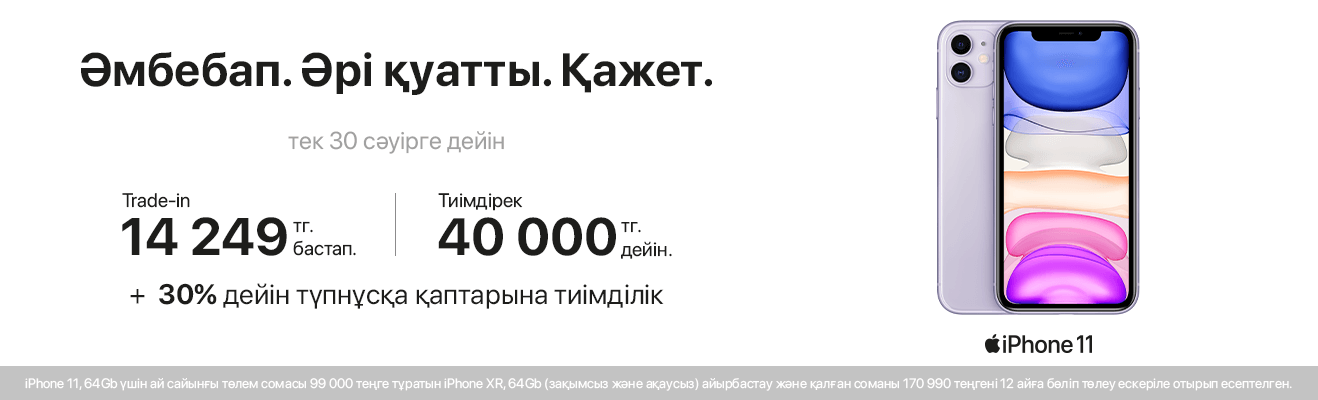 Жаңаратын кез келді! Сондықтан Apple смартфондарына промо-бағалар жариялаймыз: 3-30 сәуір аралығында iPhone 11, iPhone 12, iPhone 13 және iPhone 14-ті ұтымды ұсыныспен сатып ал. Trade-In бағдарламасын пайдалан да, ескі смартфоныңды жеңілдікке айырбастап, пайдаңды екі еселе.