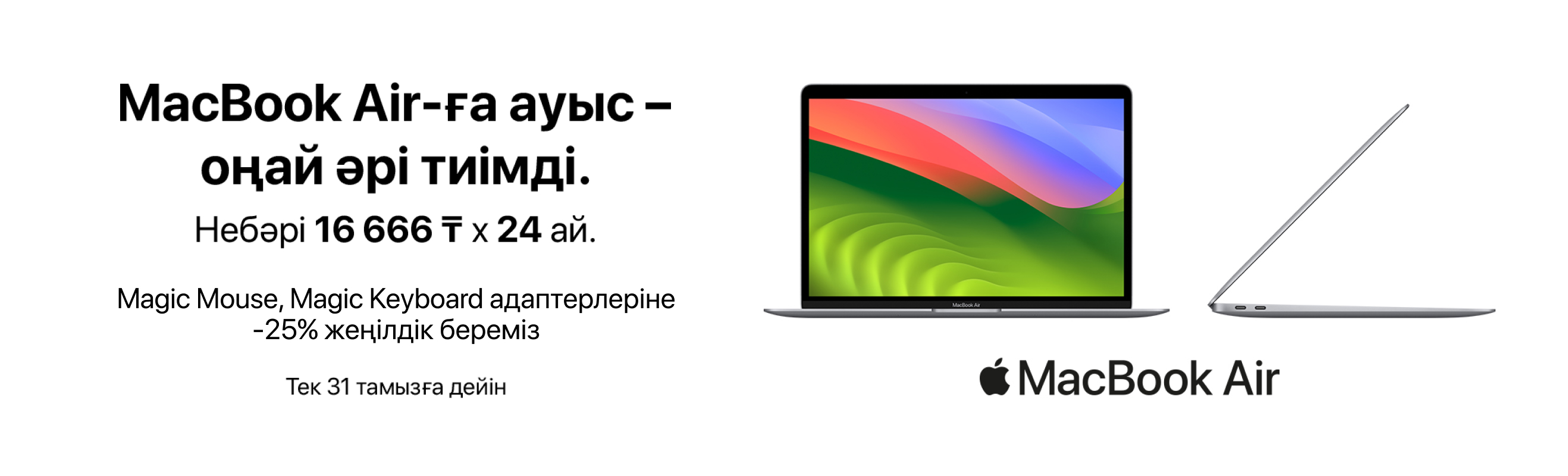 Тек қазір — iPhone, MacBook, iPad пен аксессуарларға арнайы баға ұсынамыз. Инновациялық дизайн, жоғары өнімділік пен мінсіз сападан ләззат алыңыз. Бұл — техникаңызды жаңартып, жаңа мүмкіндіктерге шабыттанудың тамаша мүмкіндігі. Үлгеріп қалыңыз — акцияға қатысатын тауар саны шектеулі!