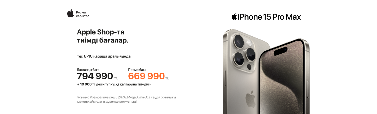 - iPhone 15 Pro, 128GB — 649 990 тг орнына 589 990 тг, 60 000 тг үнемдейсің;