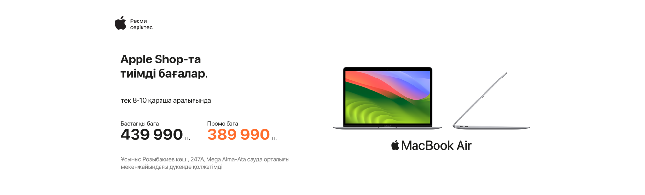 - MacBook Air, M1 — 439 990 тг орнына 389 990 тг, 50 000 тг үнемдейсің.