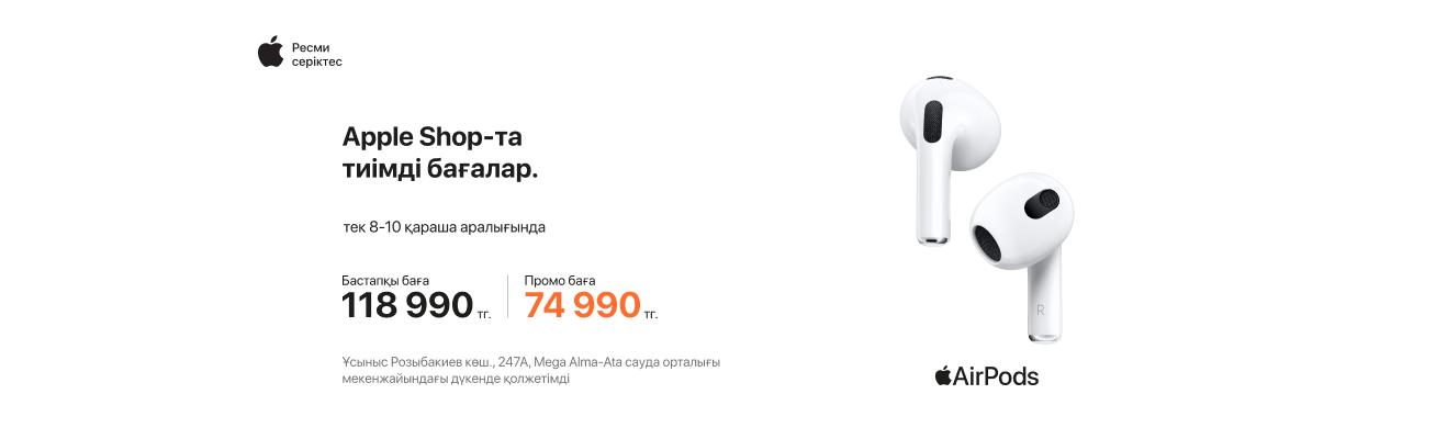 - AirPods 3 — 125 990 тг орнына 84 990 тг, 41 000 тг үнемдейсің;