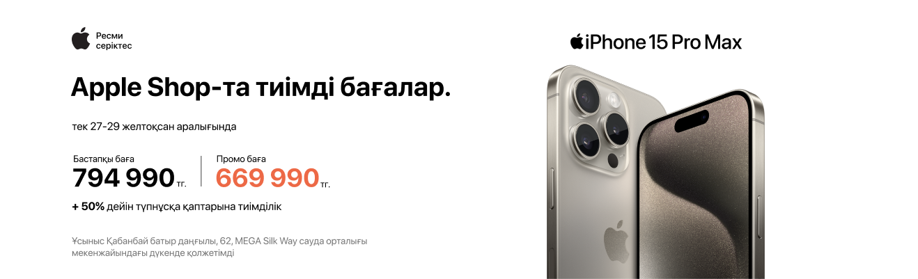 - iPhone 15 Pro Max — 669 990 тг (794 990 тг орнына, үнем: 125 000 тг);