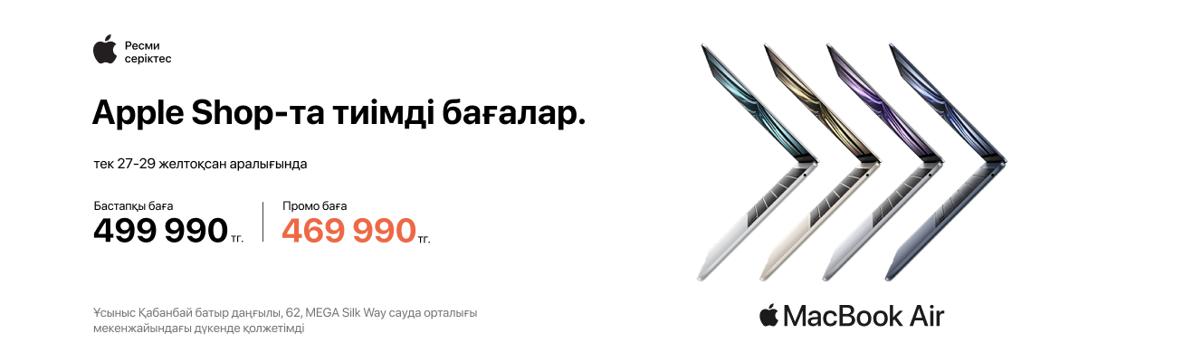 - MacBook Air — 469 990 тг (499 990 тг орнына, үнем: 30 000 тг).