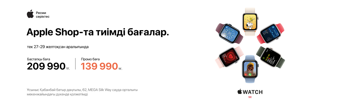 - Apple Watch SE — 209 990 тг (139 990 тг орнына, үнем: 70 000 тг);