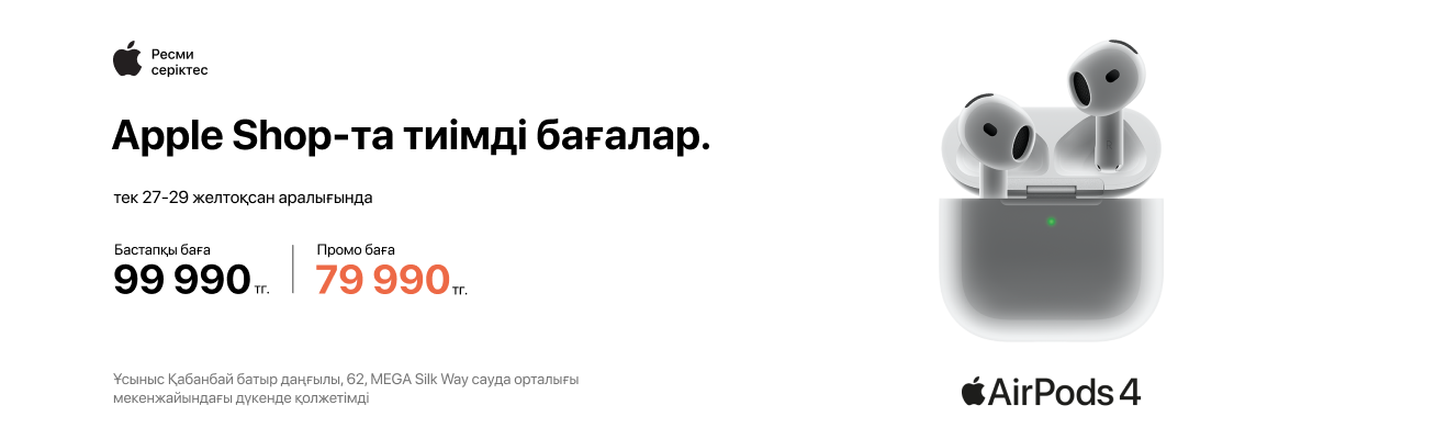 - AirPods 4 — 79 990 тг (99 990 тг орнына, үнем: 20 000 тг);