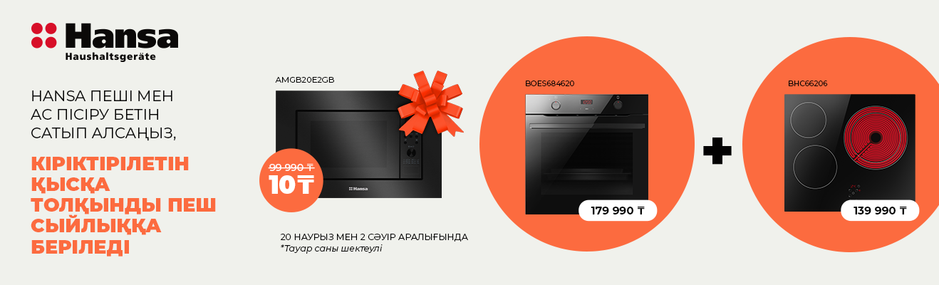 Бірден үш тауар алу - бұл тиімді шопинг! Technodom дүкендерінде Hansa-дан ас пісіру беті мен пеш сатып ал да, кіріктірілетін қысқа толқынды пешті сыйлыққа ал. Біз саған 18 айға дейін қолайлы бөліп төлеу мүмкіндігін ұсынамыз.