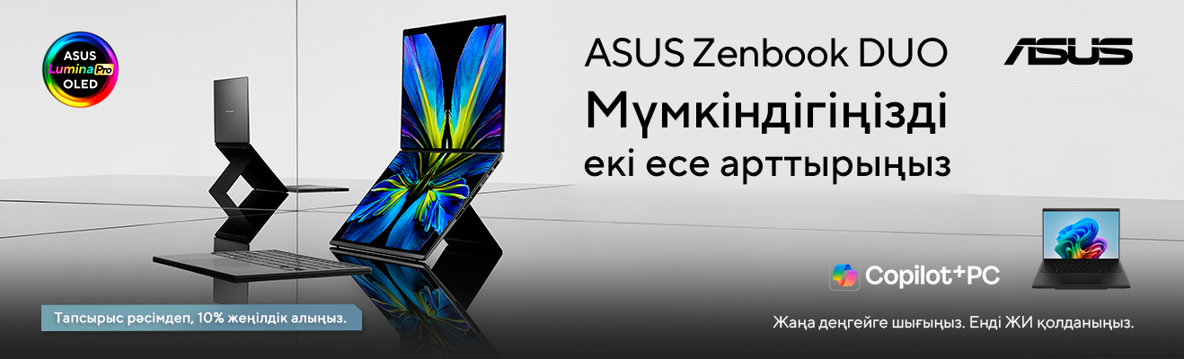 ASUS Zenbook DUO көмегімен өнімді жұмыстың жаңа деңгейіне өтіңіз. Екі экраны бар инновациялық ноутбук жұмыс істеу процесін ыңғайлы етеді, бірнеше тапсырма арасында жылдам ауысуға және бір уақытта бірнеше істі қатар атқаруға мүмкіндік береді.
