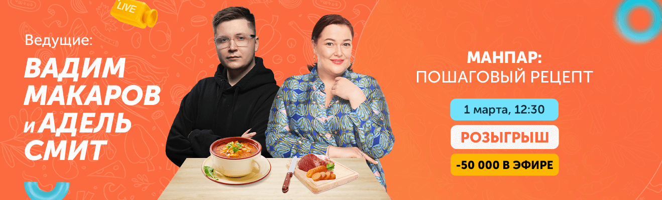 В этом прямом эфире у нас будет среднеазиатская кухня! Узнай рецепт всеми любимого Манпар от Адель Смит, получи скидку на кухонный робот Moulinex Companion XL HF-80B832 и участвуй в розыгрыше призов среди зрителей.