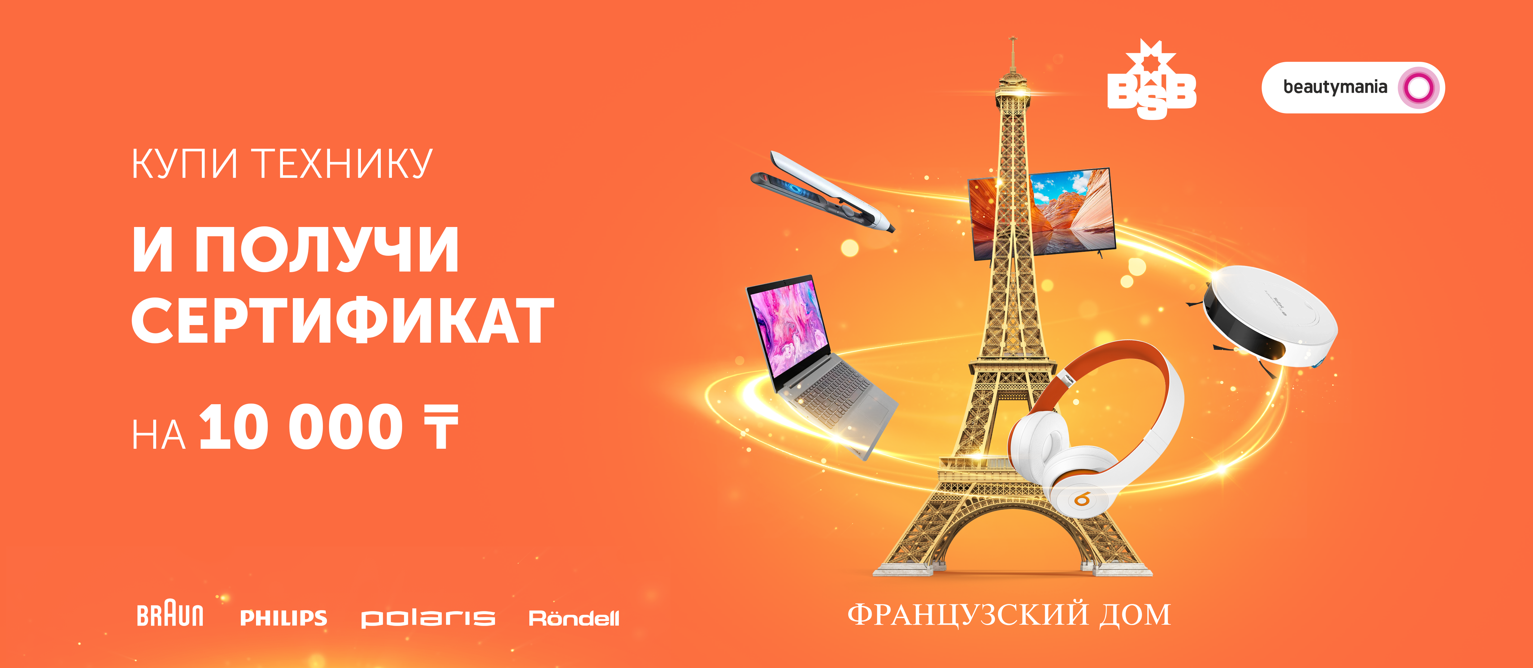 Купи товар из списка в магазине Technodom и получи в подарок сертификат на сумму 10 000 тенге на покупки в магазинах сети «Французский дом» и Beauty Mania.
