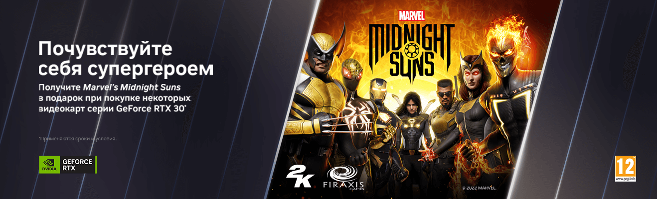 Получи новейшую игру от Marvel, Marvel's Midnight Suns, в подарок при покупке некоторых видеокарт серии GeForce RTX 30. Возглавь команду известных супергероев, чтобы помешать Матери Демонов исполнить древнее пророчество, и раскрой всю мощь видеокарт GeForce RTX 30 с технологией NVIDIA DLSS для повышения производительности.