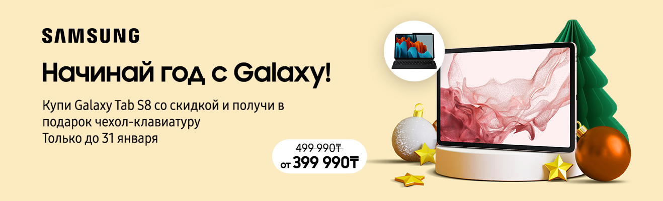 Начни 2023 с выгодных покупок и приятных подарков. Купи планшет Samsung Tab S8 по промо-цене с 1 по 31 января в наших магазинах и получи в подарок чехол-клавиатуру. Печатай быстро и удобно на своём новом планшете.