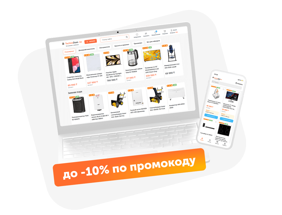 Совершайте онлайн-покупки на сайте technodom.kz или в приложении Technodom со скидкой 10%* на желанную технику. Всё просто: переходите в личный кабинет и используйте промокод со скидкой для выгодных покупок.
