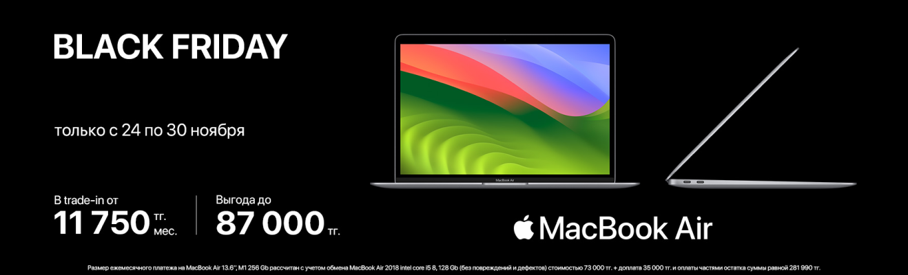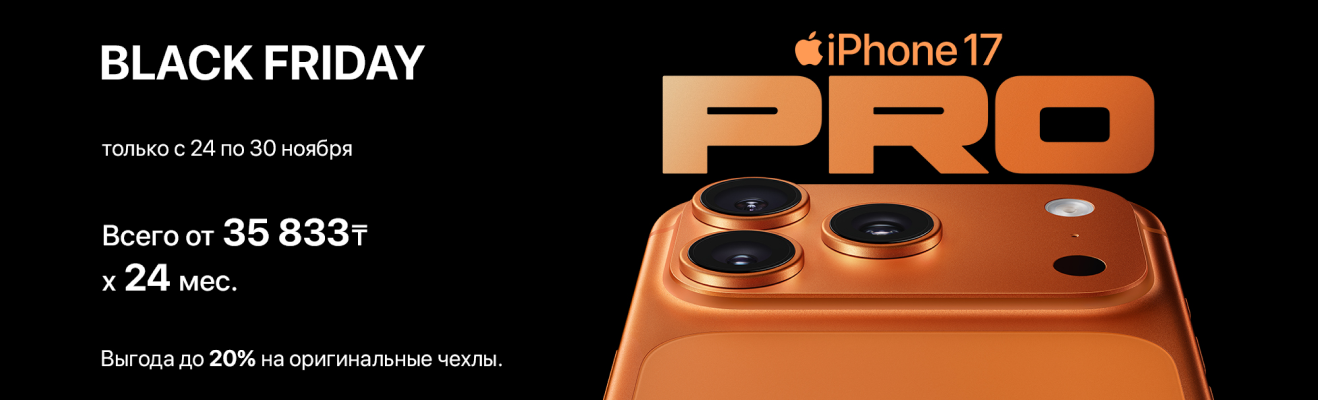 BLACK FRIDAY в TECHNODOM — главный повод обновить свою технику Apple по максимуму выгодно! С 24 по 30 ноября снижаем цены и усиливаем выгоды: берите новый iPhone 17 Pro в удобную рассрочку от 35 833 ₸ x 24 мес., получайте до 20% скидки на оригинальные чехлы и аксессуары, а вместе с MacBook Air экономьте до 87 000 ₸ по программе trade-in и платите от 11 750 ₸ в месяц.