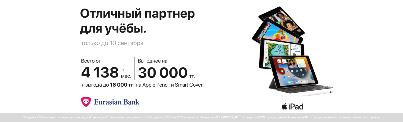 С 21 августа продукция Apple ждёт тебя по промоценам. Новый iPhone, MacBook и iPad с выгодой до 135 000 тенге станут прекрасными помощниками в учёбе!