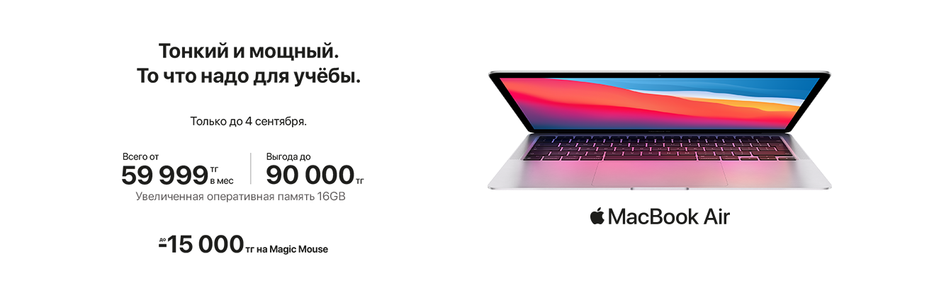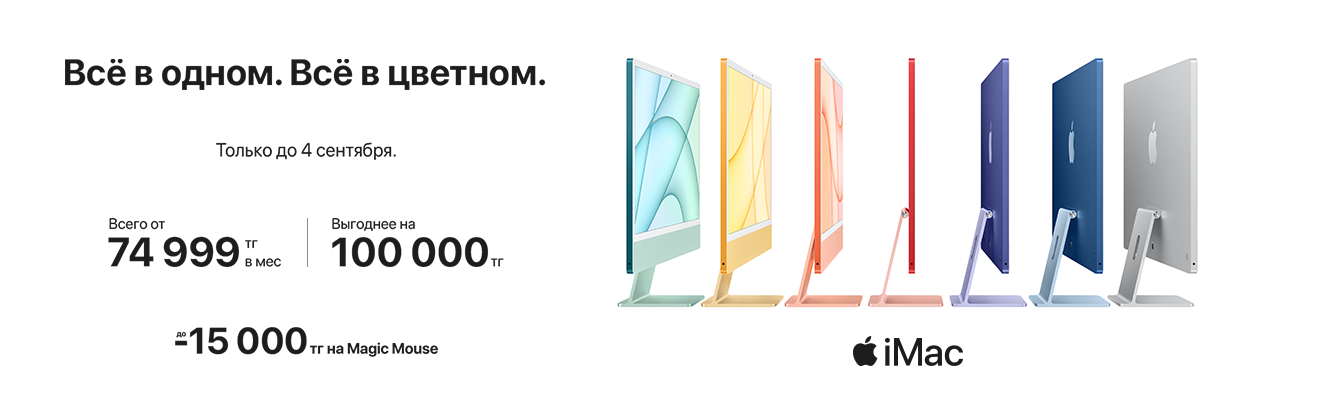 Успей приобрести IMac с выгодой до 100 000 тенге, а также MacBook – до 90 000 тенге. Бренд, знаменитый своим качеством, снижает цены с 22 августа по 4 сентября.