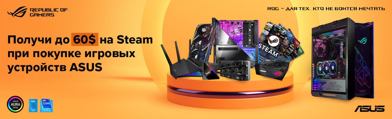 ASUS не перестаёт радовать подарками: купи игровое устройство ASUS, зарегистрируй покупку и получи свой кэшбэк до 60$ на STEAM кошелёк. Радость в реальности и в виртуальности.
