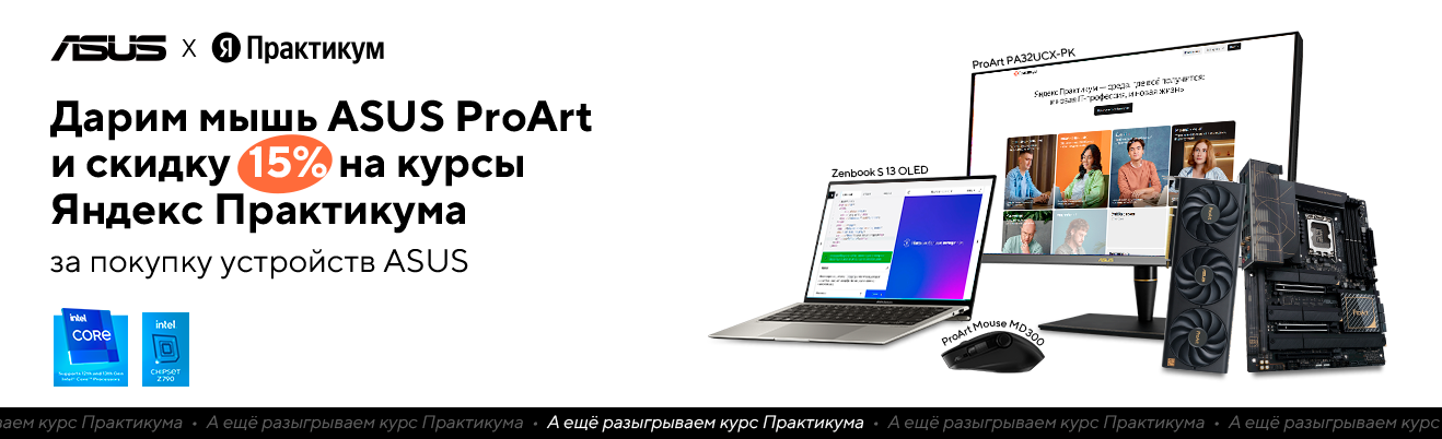 Вот это коллаб! Только с 1 по 30 ноября: купи любой ноутбук серии Zenbook, Vivobook S и Vivobook Pro, а также устройства ASUS линейки Pro Art в магазинах Technodom и получи мышь ASUS Pro Art MD300 и скидку 15% на обучение в Яндекс Практикуме. Зарегистрируй свою покупку на сайте ASUS до 7 декабря и наслаждайся по-настоящему полезными подарками.