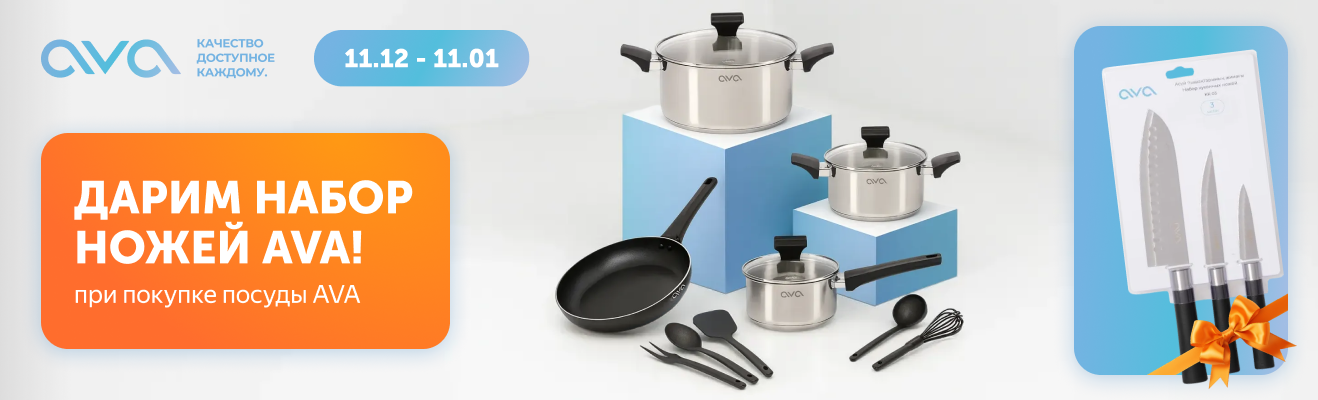 При покупке посуды AVA Вы получаете в подарок стильный и практичный набор ножей AVA.