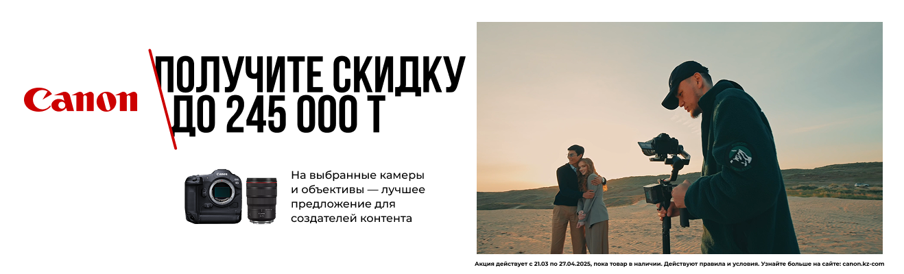 Только до 27 апреля 2025 года получите скидку до 245 000 тенге на выбранные камеры и объективы Canon — идеальный выбор для блогеров, фотографов и видеографов.