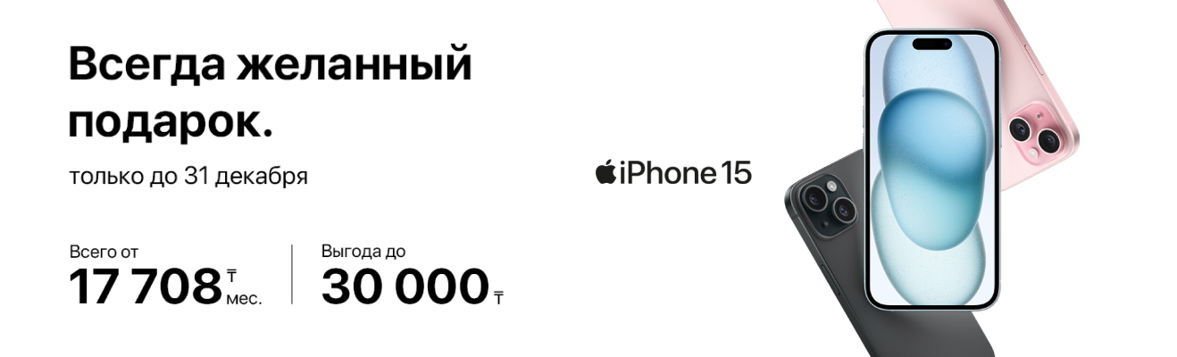 До 31 декабря вы можете приобрести iPhone 15 на выгодных условиях и экономить до 30 000 ₸. Ежемесячный платёж — всего от 17 708 ₸, что делает покупку ещё доступнее.