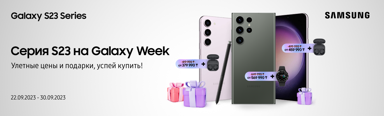 Неделя неземных скидок! Покупай смартфоны серии Galaxy S23 по выгодным ценам и получай беспроводные наушники или смарт-часы в подарок. Не пропусти Galaxy Week, обнови телефоны себе и всей семье только с 22 по 30 сентября.