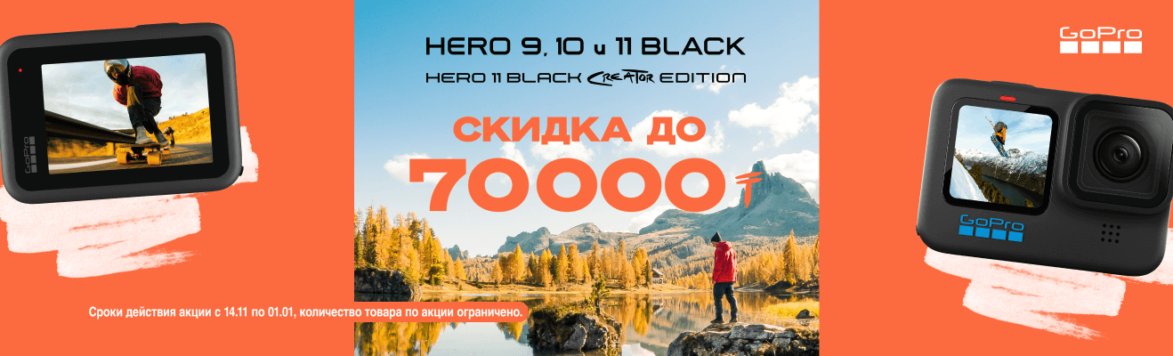 Снимай захватывающие дух видео со своих геройских приключений на последние модели action-видеокамер GoPro Hero, поражая интернет и близких людей! Приобрети их выгодно с щедрыми скидками в магазинах Technodom с 14 ноября 2022 года по 1 января 2023 года включительно.