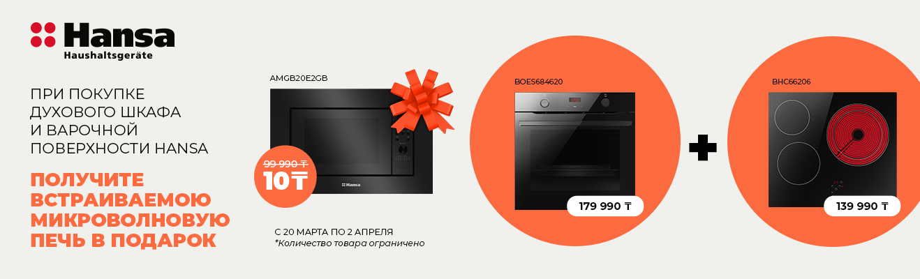 Тройная покупка – выгодный шопинг! Купи духовой шкаф и варочную поверхность от Hansa в магазинах Technodom и получи встраиваемую микроволновую печь в подарок. Мы приготовили для тебя удобную рассрочку до 18 месяцев.