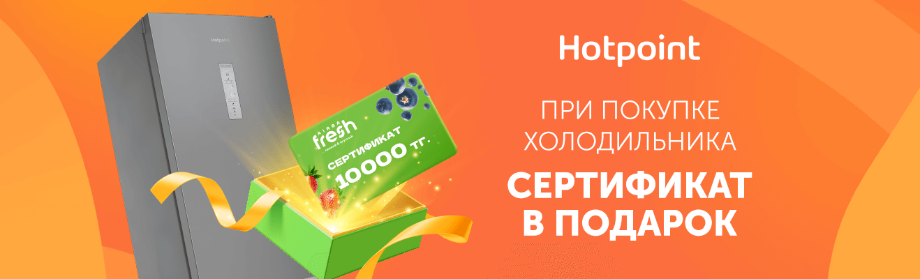 Выгода ещё больше! Купи холодильник Hotpoint, участвующий в акции, — получи в подарок сертификат на 10 000 тенге от Airba Fresh. Соверши полезную покупку и возвращайся за следующей по выигрышному предложению.