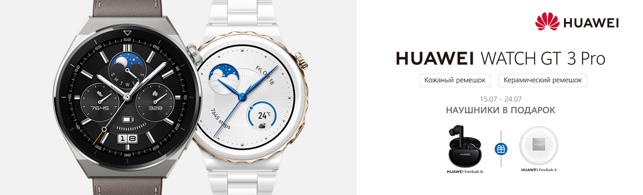 Покупай cмарт-часы HUAWEI WATCH GT3 Pro и забирай совершенно бесплатно беспроводные наушники Freebuds 4 или Freebuds 4i с 15 по 24 июля.