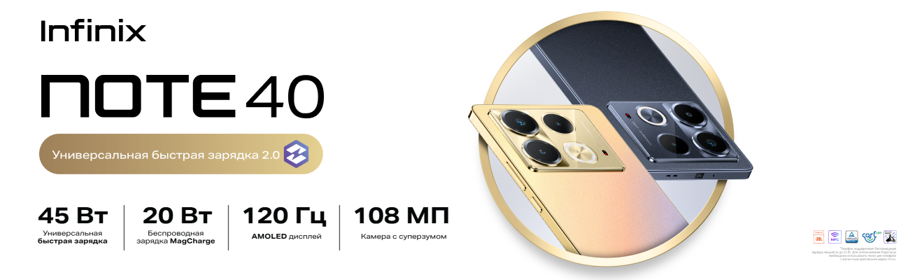 Встречай смартфон, который удивит обширным функционалом – Infinix Note 40. Его основные преимущества – долгий заряд батареи, камера с суперзумом в 108 Мп и отпечаток пальца прямо на дисплее. А в комплекте есть универсальная быстрая зарядка 45 Вт 2.0 и беспроводная зарядка MagCharge 15 Вт.