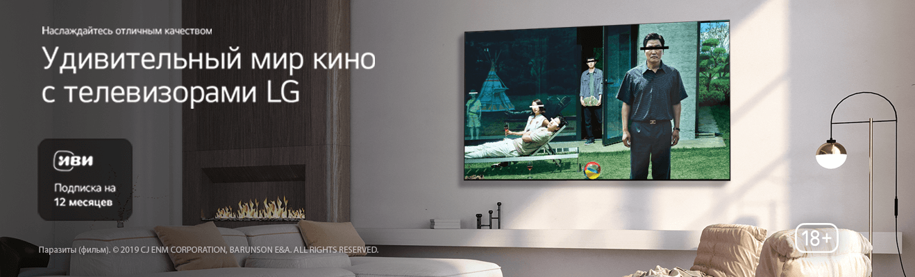 При покупке телевизора LG — в подарок подписка на онлайн-кинотеатр «Иви» на целых 12 месяцев! Тысячи фильмов, сериалов и мультфильмов без необходимости ходить в кинотеатр.