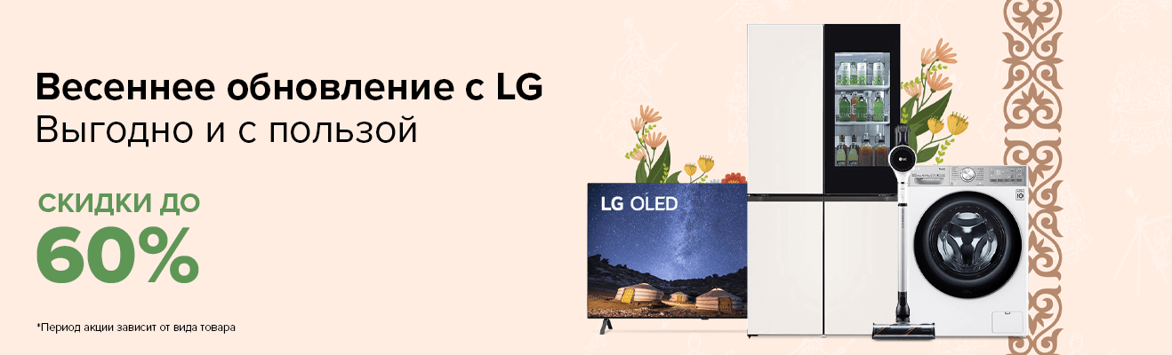 Время праздничных скидок! Встречай Наурыз с новой техникой в доме. Мы приготовили для тебя скидки до 60% на телевизоры, холодильники, стиральные машины и другую технику LG с 17 по 31 марта.