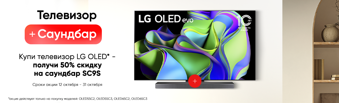 К отличному изображению обязательно нужен высококачественный звук. Купи телевизоры LG OLED серии С, участвующие в акции, и получи в подарок скидку 50% на покупку саундбара SC9S! Сделай каждый просмотр своего любимого сериала ещё приятнее.