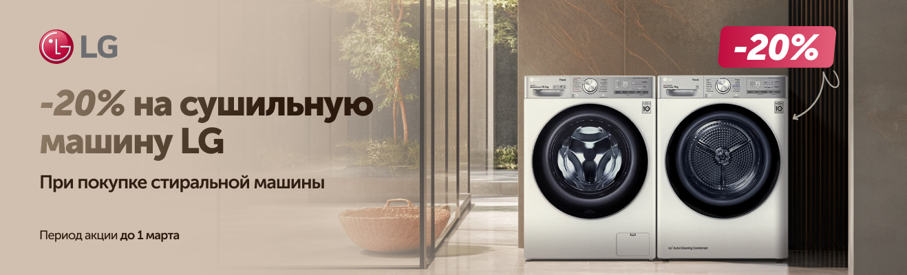 Покупайте стиральную машину LG и получите скидку 20% на сушильную машину LG.