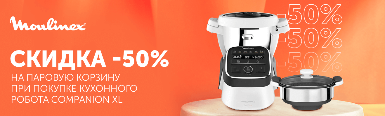 Оставь готовку роботам и наслаждайся вкусной едой выгодно! Купи кухонный робот Moulinex Companion XL HF-80B832 и получи скидку -50% на насадку Насадка пароварка Moulinex XF-384B10. Наполни кухню любимыми запахами и уютом.