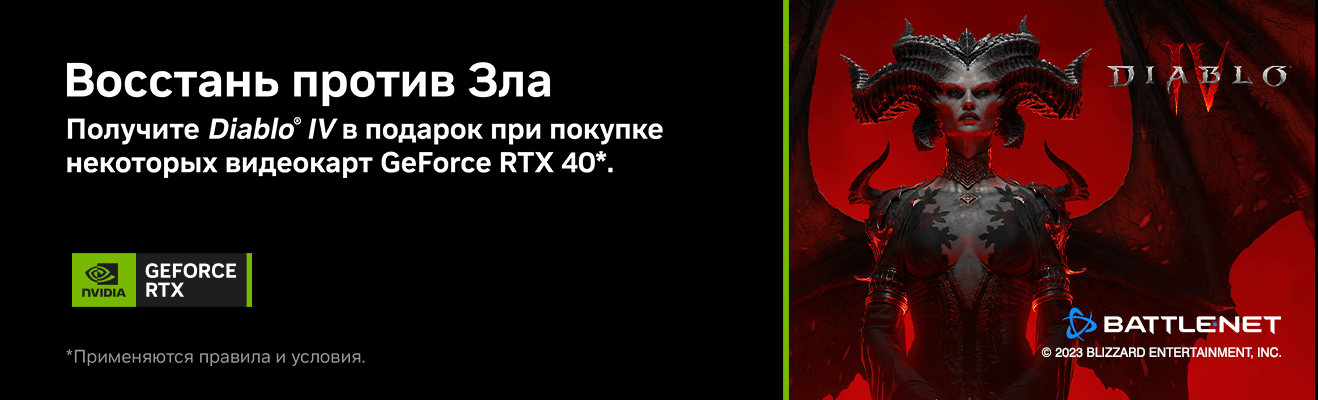 Время финальной битвы против злых сил! Купи видеокарты серии GeForce RTX 40, участвующие в акции, укажи нашу бонусную карту и получи в подарок игру Diablo® IV Standard Edition Game. Насладись реалистичным геймплеем и невероятным изображением.