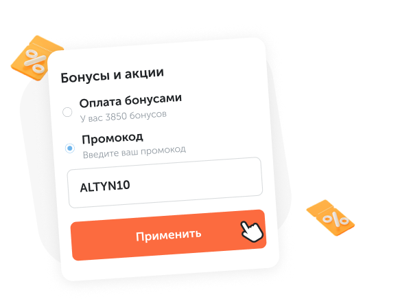 При оформлении заказа введи промокод «ALTYN10» в поле «Промокод»