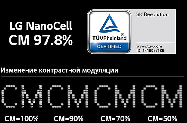 По требованиям CTA при определении разрешения контрастная модуляция (КМ) должна быть 50% или выше. Чем выше значение КМ, чем четче изображение. У LG NanoCell уровень КМ – 97,8%. Это значительно превышает международные стандарты и делает чистые цвет еще чище.