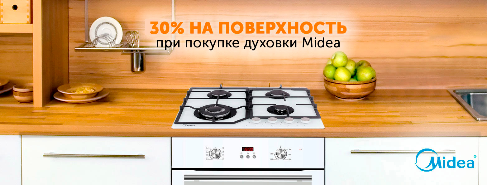 30% скидки на встраиваемую поверхность при покупке духовки Midea!
