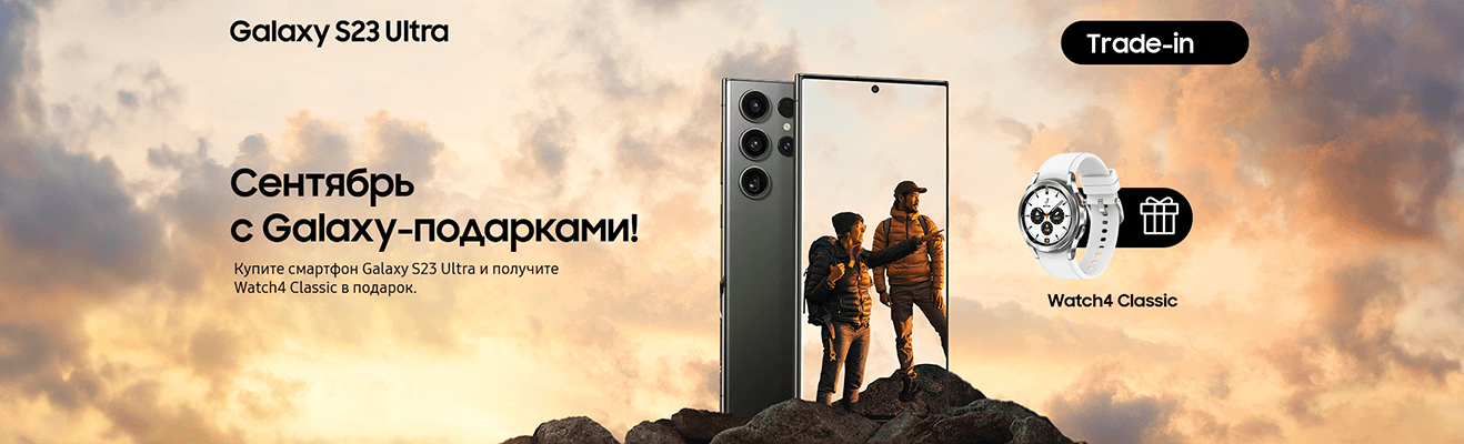 - Купи Galaxy S23 Ultra и получи смарт-часы Watch4 Classic в подарок;