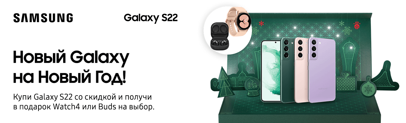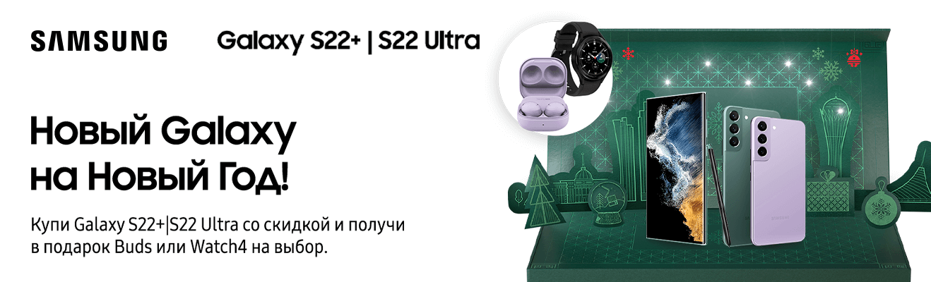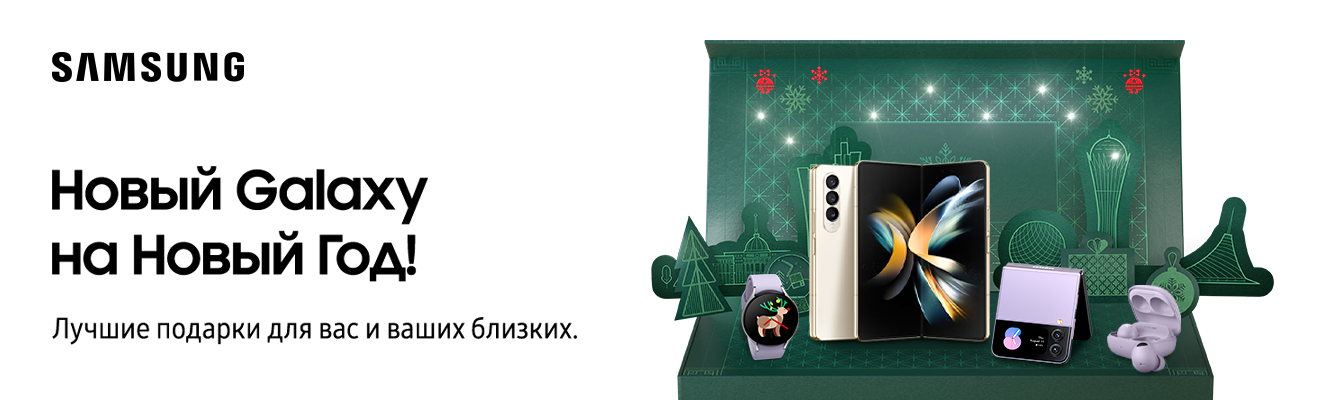 Проведи 2023 год выгодно: покупай смартфоны Samsung с 1 по 31 декабря в наших магазинах и получай крутые гаджеты в подарок: беспроводные наушники серии Buds или смарт-часы Galaxy Watch4 на выбор, а также сертификат на подписку Яндекс.Плюс Мульти на целых 12 месяцев.
