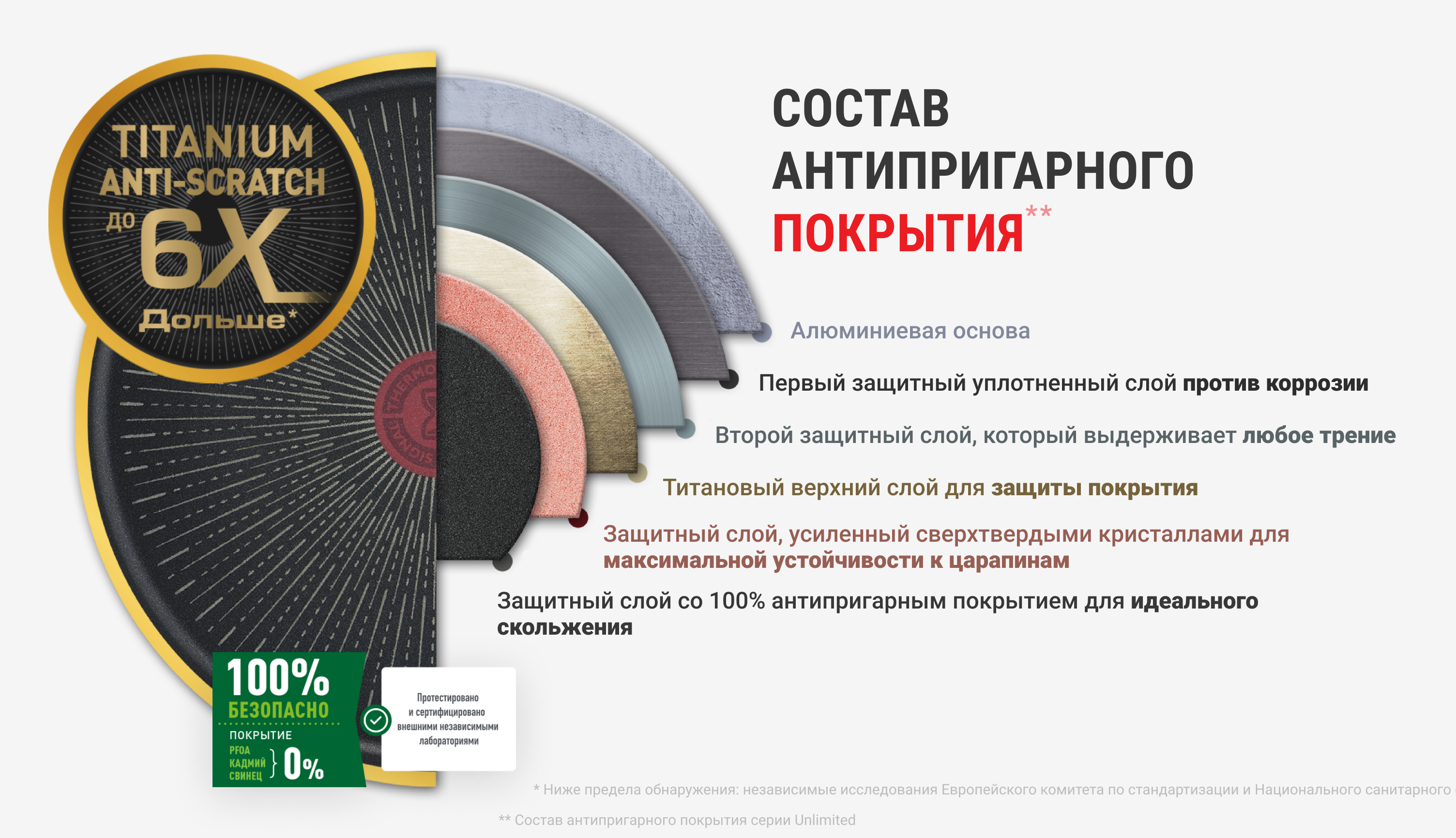 Без царапин и пригорания: обеспечивает исключительную стойкость, что позволяет увеличить срок службы в 6 раз*