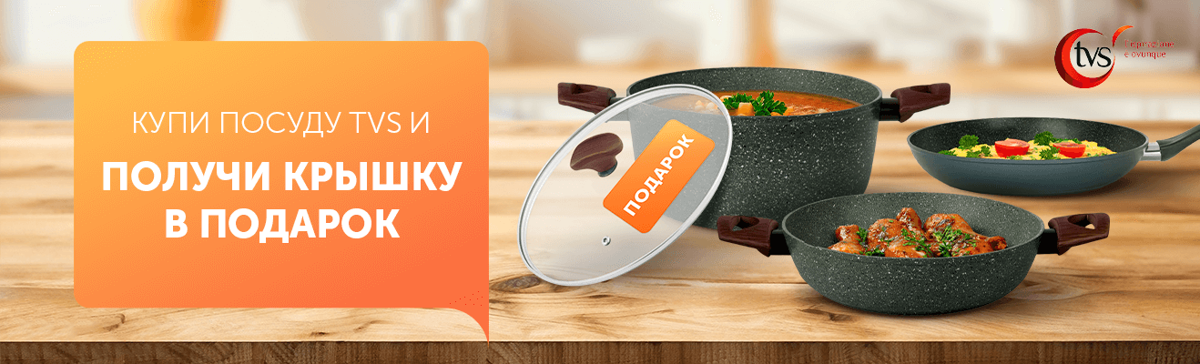 Собрали для тебя маст-хэв для вкусных блюд – безопасная посуда TVS для приготовления еды. Посуда TVS произведена в Италии, что гарантирует высокое качество и экологичность продукции. Покупай желанную посуду TVS из подборки и получи к ней крышку в подарок.
