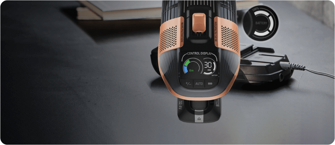 Наслаждайтесь беспрерывной и качественной уборкой во всем доме благодаря съемной литиевой батарее, которую удобно заряжать в любом месте.