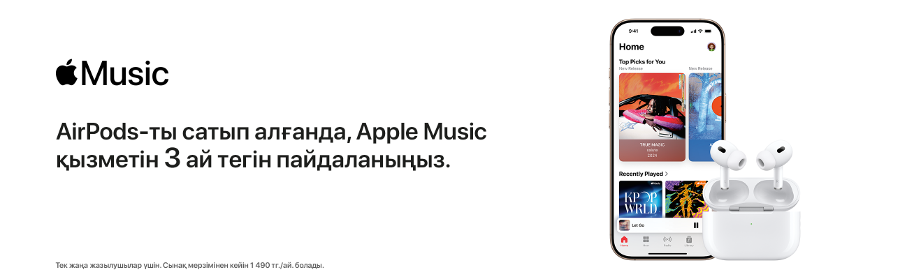 Музыка әлеміне еш шектеусіз бойла — AirPods сатып алғанда Apple Music-ке 3 ай тегін жазыла аласың.