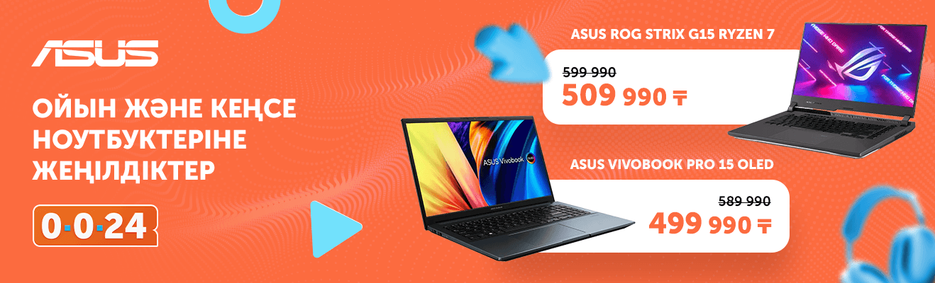 Жеңілдіктер мен тиімді ұсыныстарды өткізіп алма! 17-30 сәуір аралығында акцияға қатысатын Asus ойын және кеңсе ноутбуктеріне төмендетілген бағалар жариялаймыз. Бүгін жұмысқа немесе ойынға арналған жылдам әрі қуатты ноутбукті 24 айға бөліп төлеуге сатып ал да, бір айдан соң төле.