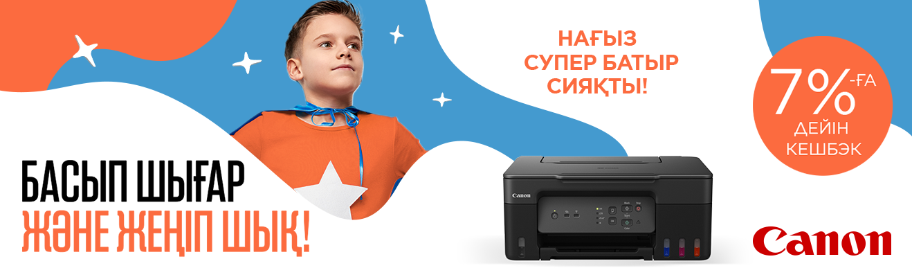 Рефераттар, құжаттар және шексіз басып шығару маусымы таяп қалды. Оқу жылының басталуына дайын бол - Canon КФҚ сатып ал да, бонустық картаңа 7%-ға дейін Cashback ал. Стиль, ықшамдылық және ыңғайлылықтың рахатын сезін!