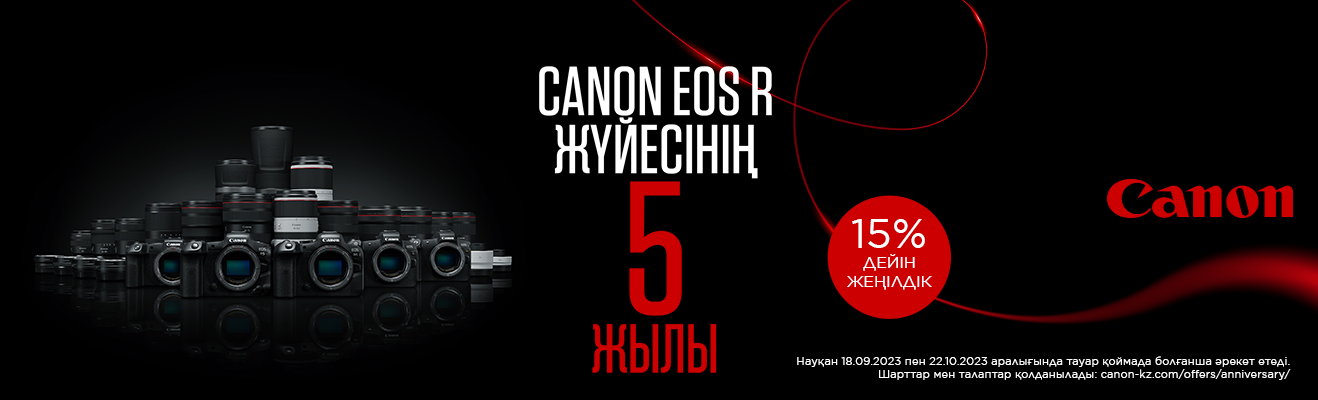 EOS R жүйесінің 5-жылдық мерейтойын тойла! Акцияға қатысатын Canon фотоаппараттарын, бейнекамераларын, объективтерін және экстендерлерін 15% жеңілдікпен сатып ал. Революциялық автофокустау технологиясы мен RF объективтерінің керемет ассортиментінің арқасында жаңа деңгейдегі суреттерді түсір.
