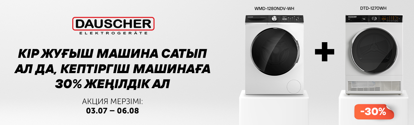 Сен үшін таза пайда мен соңғы жеңілдіктер! Акцияға қатысатын Dauscher кір жуғыш машинасын сатып ал да, кептіргіш машинаға 30% жеңілдік ал. 3 шілде мен 6 тамыз аралығында ұтысты акцияны жіберіп алма.