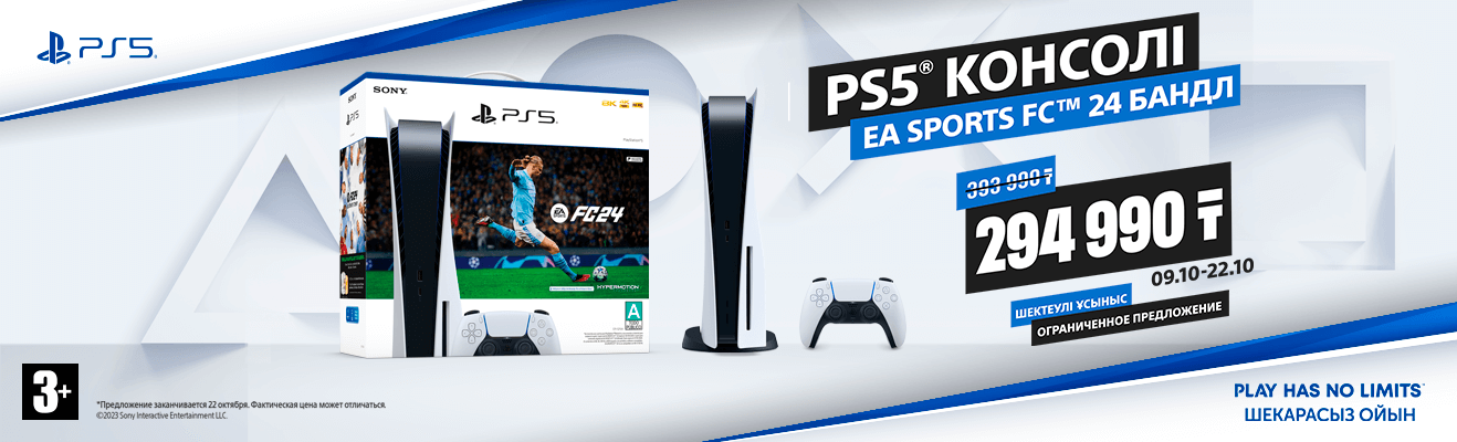Бір ұсыныстан екі рет пайда көр: PlayStation-ді 393 990 теңгенің орнына небәрі 294 900 теңгеге ал да, сыйлыққа су жаңа ойын EA Sports FC 24-ті ал!